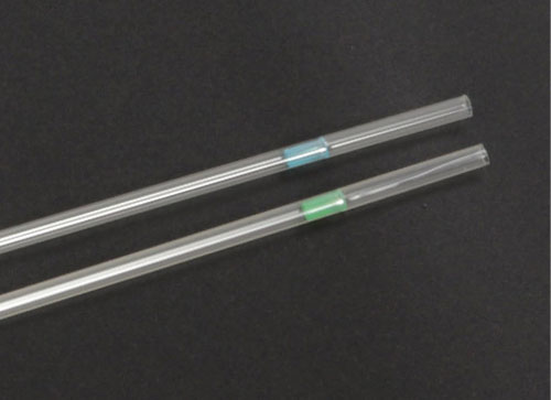 縦穴式のシース管で、内部にストローの先端を固定するパーツが入っています。そのパーツの色は、切れ目有りが緑色で切れ目無しが青色です。